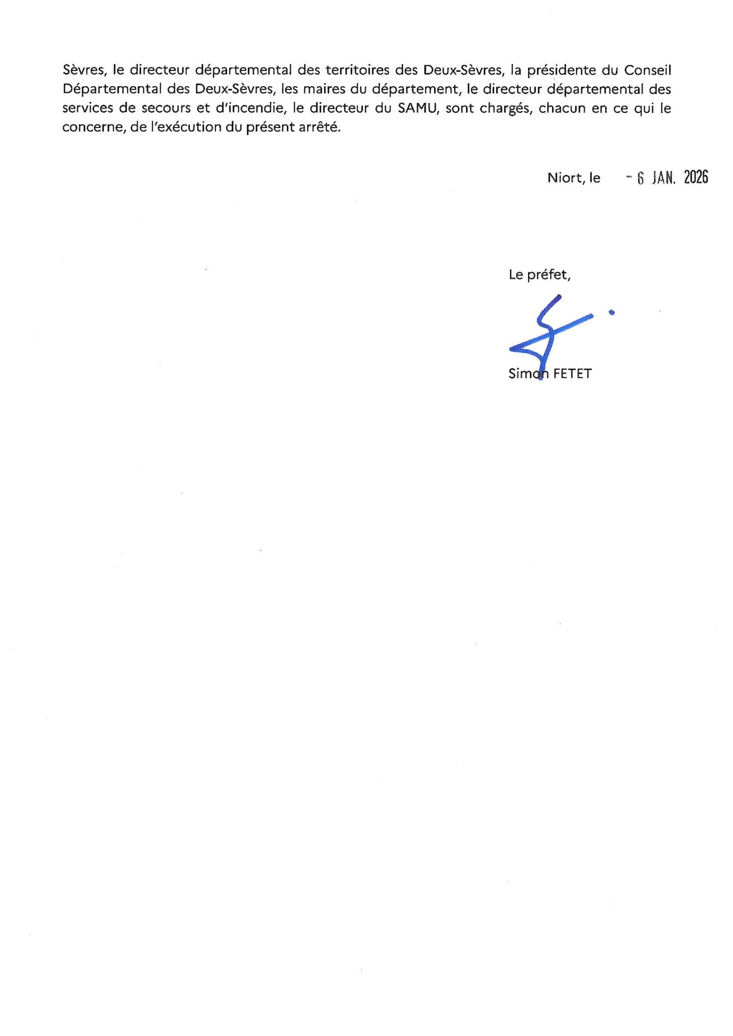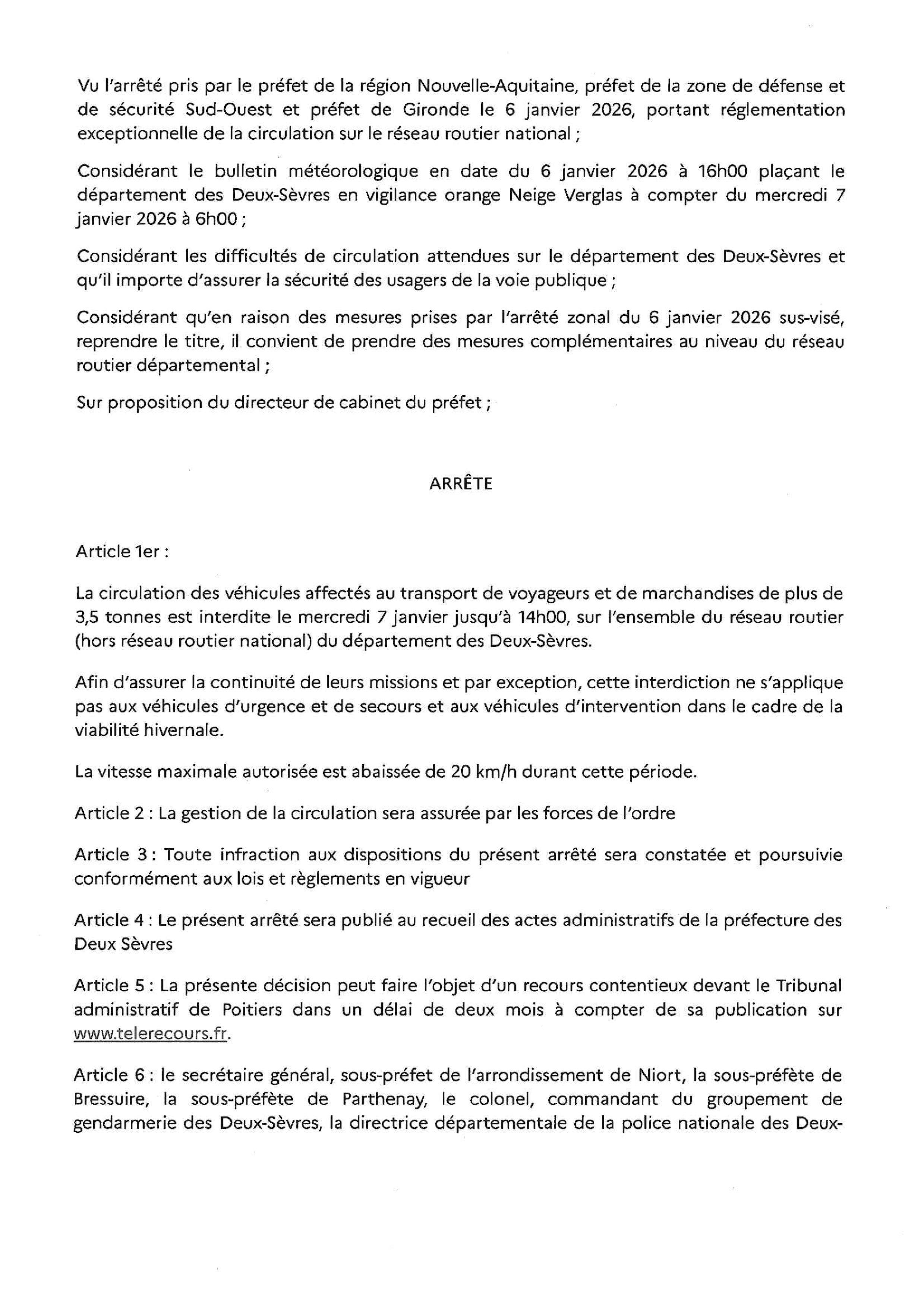 Arrêté prefectoral portant limitation du trafic en Deux-Sèvres - 6 janvier 2026
